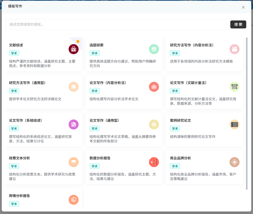 - 打开“模板写作”窗口,浏览或通过顶部搜索栏查找目标模板(如“文献综述”)。