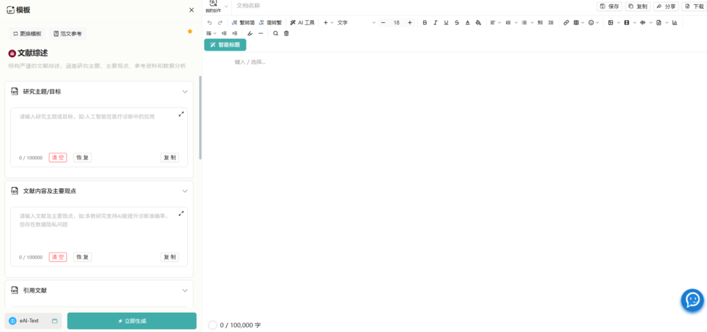 - 在左侧配置面板中,依序填写模板特定的核心字段(如“研究主题/目标”、“文献内容及主要观点”等)。