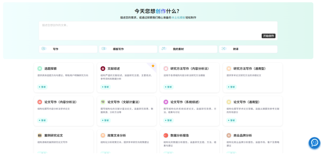 首页概览 首页是用户登入后,访问平台的第一个页面,它可以帮助你快速到达平台的主要功能。 主要组件 1. 创作类别 自由创作:点击「开始创作」以自由发挥您的创意。模板创作:选择任一模板可快速进入写作页面,节省创作时间。 2. 我的素材 点击此选项,您将进入「我的素材」页面,方便管理和使用已上传的素材。 3. 转译 在此区域,可快速进入转译页面,将音视频转成文字内容。 4. 场景化模板 在下方模板库中,根据业务需求选择“文献综述”、“数据分析报告”等特定场景卡片,进入结构化写作流程。 文档导航我的创作 → 这篇文章对您有用吗? 是 否 我们要如何帮助您? 名称 邮件 主题 信息