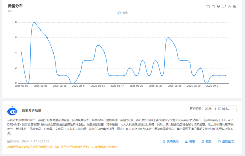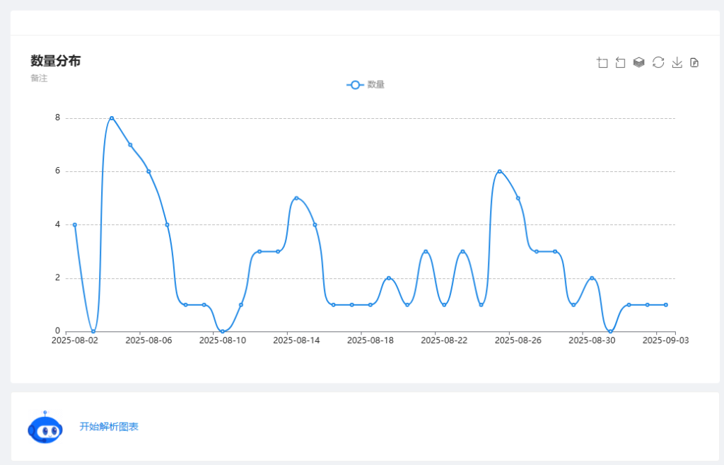 AI图表解析 AI图表解析能够分析图表中的数据和视觉元素,自动生成对图表趋势和关键信息的解读,无需人工干预。 点击【开始解析图表】,可生成图表解析内容。 文档导航← 编辑图表统计模组 → 这篇文章对您有用吗? 是 否 我们要如何帮助您? 名称 邮件 主题 信息